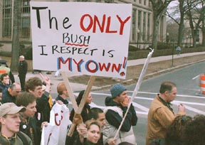 A protester voices her opinion with a sign while marching in an anti-war rally yesterday.