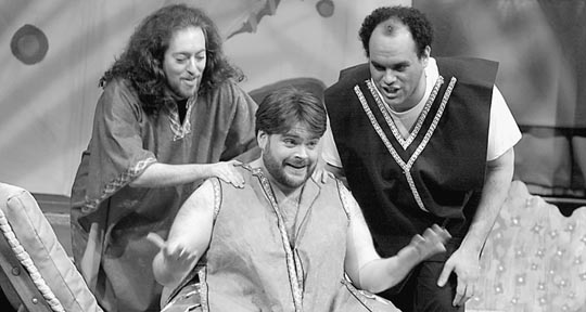 Scaphio (Brian Bermack ’95), Phantis (Ahmed E. Ismail G), and the King (David Daly) share a laugh about the humorous side of being the King.