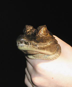 A student holds a tiny allegator-like animal called a Cayman during a nighttime trip down the river.