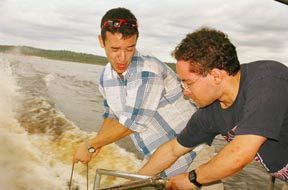 Emma R. Bassein ’06 eyes a shelf full of pihranas in a village craft store.