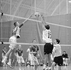 Freshman Milo Raimondi ’06 blocks a spike in a volleyball match against the Division II University of New Haven team. MIT lost the match 3-0.