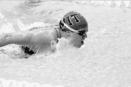 Georgene M. Hilb ’04 explodes from the water in her butterfly stroke. MIT women lost to Amherst College, 136 to 159, in their Feb. 1 meet.