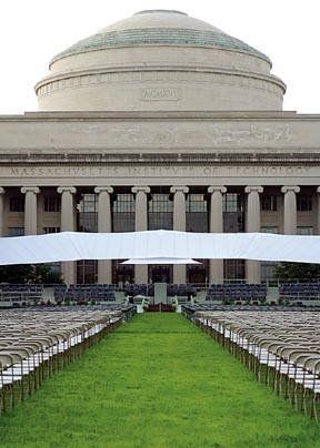 An empty Killian Court awaits this afternoon’s commencement ceremony. Commencement weather is likely to be overcast, with some chance of clearing in the afternoon.