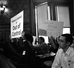 Opponents of Cambridge’s smoking ban protested in the city council chambers June 9th prior to the ban being voted into law.