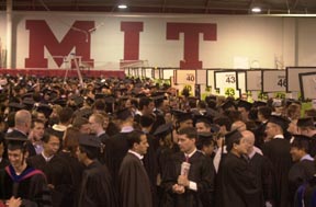 Members of the class of 2003 gather in Johnson Athletic Center before marching to Killian Court for commencement.