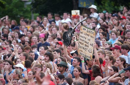 Two Guster fans try to get an invitation backstage.
