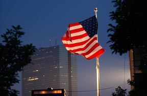 A United States flag lit by spotlights flaps in the breeze against the backdrop of the Hancock tower.
