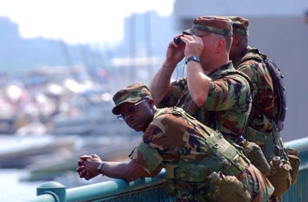 Three members of the National Guard keep a lookout for suspicious activity during Boston's Fourth of July celebration.