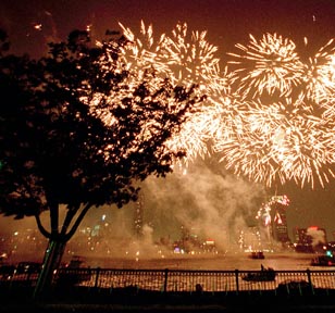 Fireworks illuminate the waters of the Charles River along Memorial Drive.