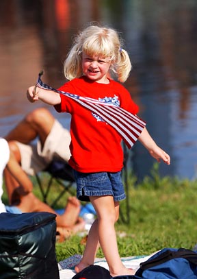 Lindsey Deluga of Lake Zurich, Illinois, waves a flag on the Esplanade while waiting for the start of the fireworks.