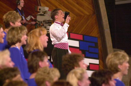 Keith Lockhart of the Boston Pops Esplanade Orchaestra directs the crowd singing patriotic songs, including the service marches of the Army, Air Force, Navy, Marines, and Coast Guard.