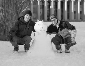 Alex Donaldson ’06 and Ian Brelinsky ’06 build a snow beaver on Killian Court Monday afternoon.