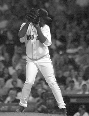 Red Sox pitcher Pedro Martinez works from the stretch against the Anaheim Angels, Aug. 6 at Fenway Park. Martinez pitched a complete game as the Sox won 4-2.