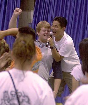 Playfair, Inc. employee Jin Ghun introduces William Barge ’07 as he MCs Playfair at freshman orientation.