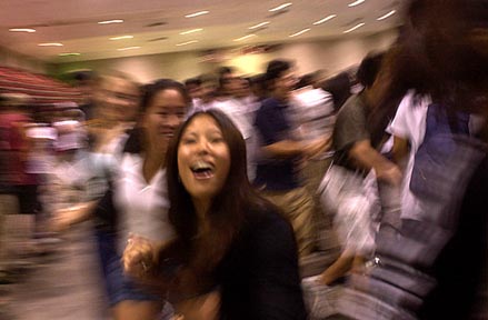 Freshmen run through Johnson Ice Rink with arms linked to kick off Playfair.