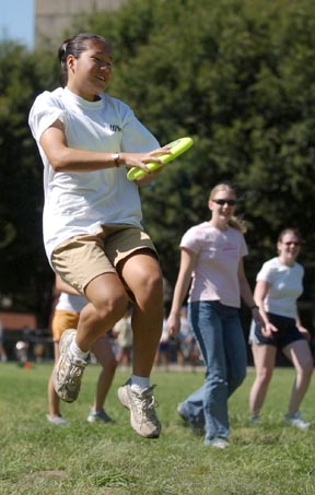 Christine Fanchiang ’07 leaps to catch a Frisbee during a game hosted by the MIT Women’s Ultimate Frisbee team at Kresge Oval.