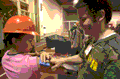 The most eye-catching display on the upper floor of Johnson was the East Campus booth, which featured a fort, flashing lights, maps, camouflage uniforms and netting, and a working fireman’s pole.