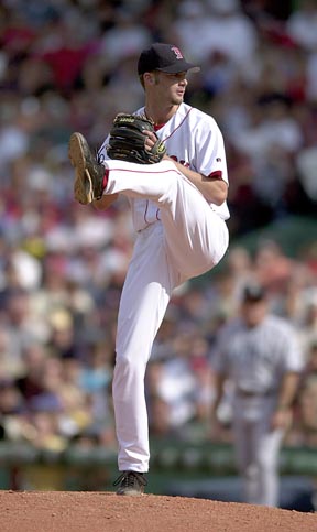 Red Sox pitcher Bronson Arroyo pitches the last three innings at Fenway Park against the Seattle Mariners on August 25 for his first major league save.