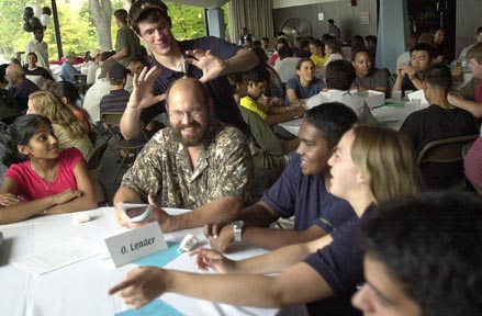 Mechanical Engineering Professor Alex Slocum entertains incoming freshman Ryan E. Pester ’07, Neera Jain ’06, and Joy Tang ’07 at a student-faculty dinner on Tuesday evening.