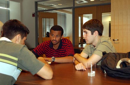 Steven K. Kannan ’06 (left) and Kevin E. Stolt ’06 (right) talk to Bereket S. Kifle ’07 about Concourse at the program’s open house Tuesday.
