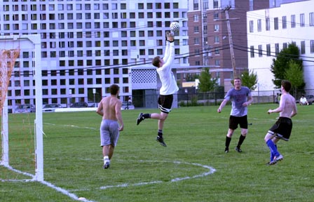 R. Morgan Mills ’05, goalie of the men’s varsity soccer team, made a save Tuesday evening on Briggs Field. Many teams begin practice this week.