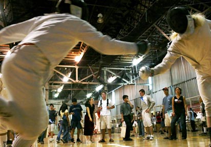Michael N. Beregovsky ’06, left, scores a point against fencing partner Galen E. Pickard ’05 at the Athletics Gateway in Rockwell Cage Wednesday afternoon.