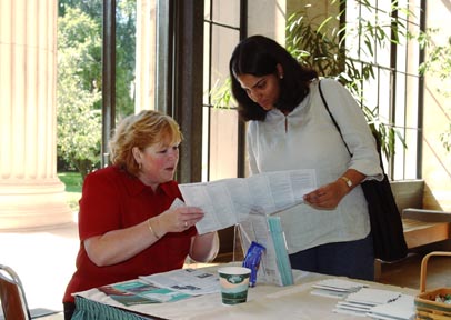 MIT Federal Credit Union representative Kimberly Shooter shows first-year graduate student Divya Mathur locations of Credit Union ATMs on a map.