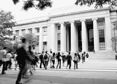 Members of the MIT community cross Massachusetts Avenue Wednesday morning. Wednesday marked the first day of classes for the fall semester.