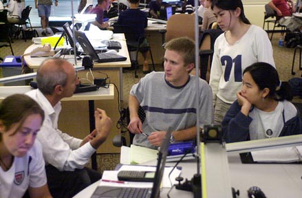 Lecturer Peter Dourmashkin ’76 answers the questions of Nathan A. Pfaff ’07 and Helen Tsai ’07 about a basic kinematics experiment.