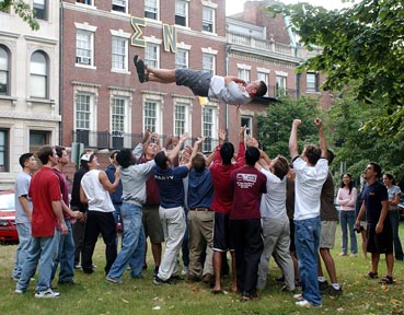 Joseph F. Walsh ’07 is thrown into the air during his pledge ceremony outside Sigma Nu Saturday.