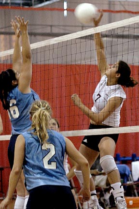 Outside hitter Arlis A. Reynolds ’06 taps the ball over the net and past two Mount Holyoke players Saturday, Sept. 20. MIT swept the match with game scores of 30-13, 30-14, and 30-14.