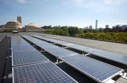 An array of 24 solar cells collects the morning sun on the roof of the Student Center.