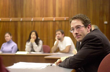 Jonathan Goler G fields questions from a panel of dormitory representatives Monday night. The UA-sponsored discussion focused on MIT’s official policies regarding the hanging of banners and flags on the outside of dormitories.