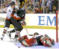 Yes, as you’d expect, the game itself was nothing special (and very high scoring, with a final of 18-10 for Team EMC over Team MasterCard), but it was the little things throughout that made it fun to watch. For example, I never knew that John Kerry was such an imposing man until I saw him cross skatepaths with hall-of-famer Pat Lafontaine. While the firefighters in attendance, largely from New York, Boston, and Worcester, garnered much attention for their heroic sacrifices, it was the appearance of Michael J. Fox that brought the Fleet Center to its feet. It took no more than three seconds for the sizeable crowd to rise to its feet when Fox’s face appeared on the Jumbotron, and I suspect that even though it was a bizarre sight -- a 5’5” man standing beside athletes, firefighters and 6’4” Tim Robbins -- no one thought it was less than heroic for him to take part. When he scored a tip-in goal halfway through the first period, the volume went up again.