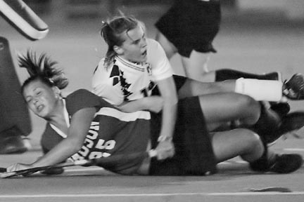 A Babson College player collides with MIT field hockey co-captain Deanna Lentz ’05 during a match last Tuesday evening. After rallying back from a 3-0 deficit, MIT lost in overtime 4-3.