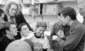 The MIT Logarhythms serenade a blushing Karissa D. Patterson ’03 with their rendition of “Baby Face” for Valentine’s Day during Introduction to Experimental Biology (7.02) laboratory.