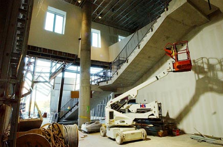 A lift, used for installing lights in the lobby of the Stata center, sits next to a newly completed staircase to the second floor.