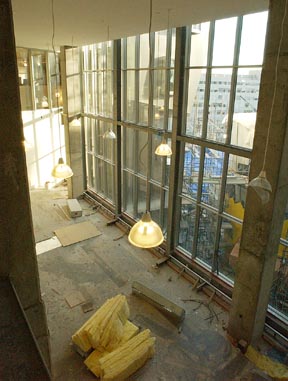 Lights hang beside enormous windows in the the spacious hallways of the incomplete Stata center. The Stata center is due to be complete in the spring of 2004.