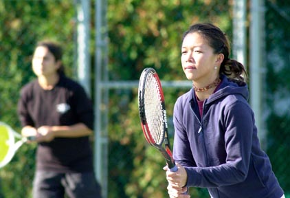 Credit: JIMMY CHEUNG - THE TECH Caroline Tien '04 waits, ready for the ball, in her semi-final doubles match with Shima Rayej '04. Tien and Rayej, MIT's top ranked women's tennis players, defeated their opponents from Smith College 8-4. |