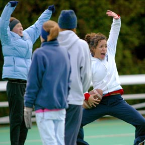 Nayeli A. Dault ’04, right, and Sarah E. Sheppard ’06 celebrate a touchdown during the Panhellenic Association’s annual Powderpuff football game.