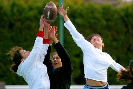 Nayeli A. Dault ’04, Lila R. Baaklini ’06, and Bella C. Liang ’06 go up for a Hail Mary pass during the Panhellenic Associaton’s annual Powderpuff football game.