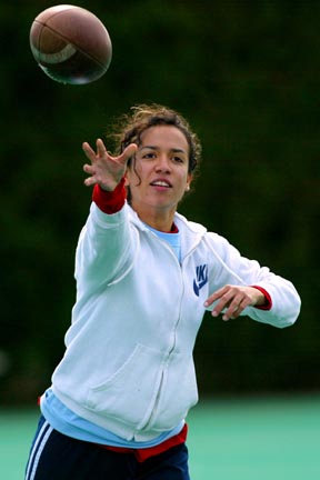 Nayeli A. Dault ’04 throws the ball downfield during the Panhellenic Associaton’s annual Powderpuff football game.