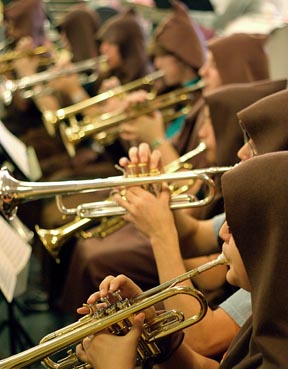 The trumpet section, dressed as the self-flagellating monks from Monty Python, in Wagner’s “Elsa’s Procession to the Cathedral.”
