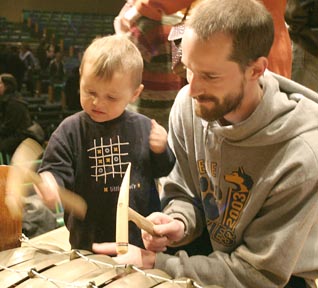 Wells Crosby, 1, and his dad Benjamin T. Crosby G try out some traditional Balinese instruments after the Gamelan Galak Tika performance at Kresge Auditorium on Sunday.