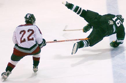 Adam Shabshelowitz ’06 trips up a Lyndon State opponent. The Engineers dominated the visitors 11-2, bringing their record to 3-0.