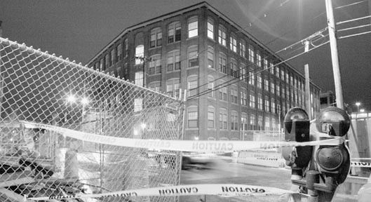 A construction fence and caution tape blocks the sidewalk opposite Edgerton House. Edgerton residents are upset over noise and dust created at the work sites on Albany and Cross streets.