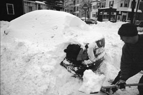 DUDE, WHERE'S MY CAR?--Cambridge resident Matt Link uncovers his roommate’s car on Tuesday afternoon. Boston received 27.5 inches of snow Monday night.