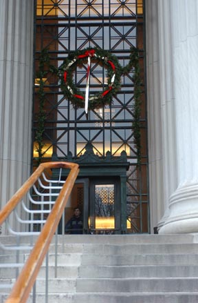 In the spirit of the holiday season, a colossal wreath hangs on the entrance of 77 Massachusetts Avenue.