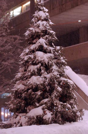 The annual Christmas Tree decorating the steps of the Stratton Student Center lies underneath a blanket of snow.