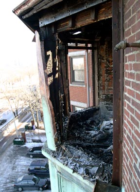 A burned-out bay window on the fourth floor of the Beta Theta Pi fraternity house overlooks Storrow Drive. A Friday night fire caused more than $100,000 in damages.